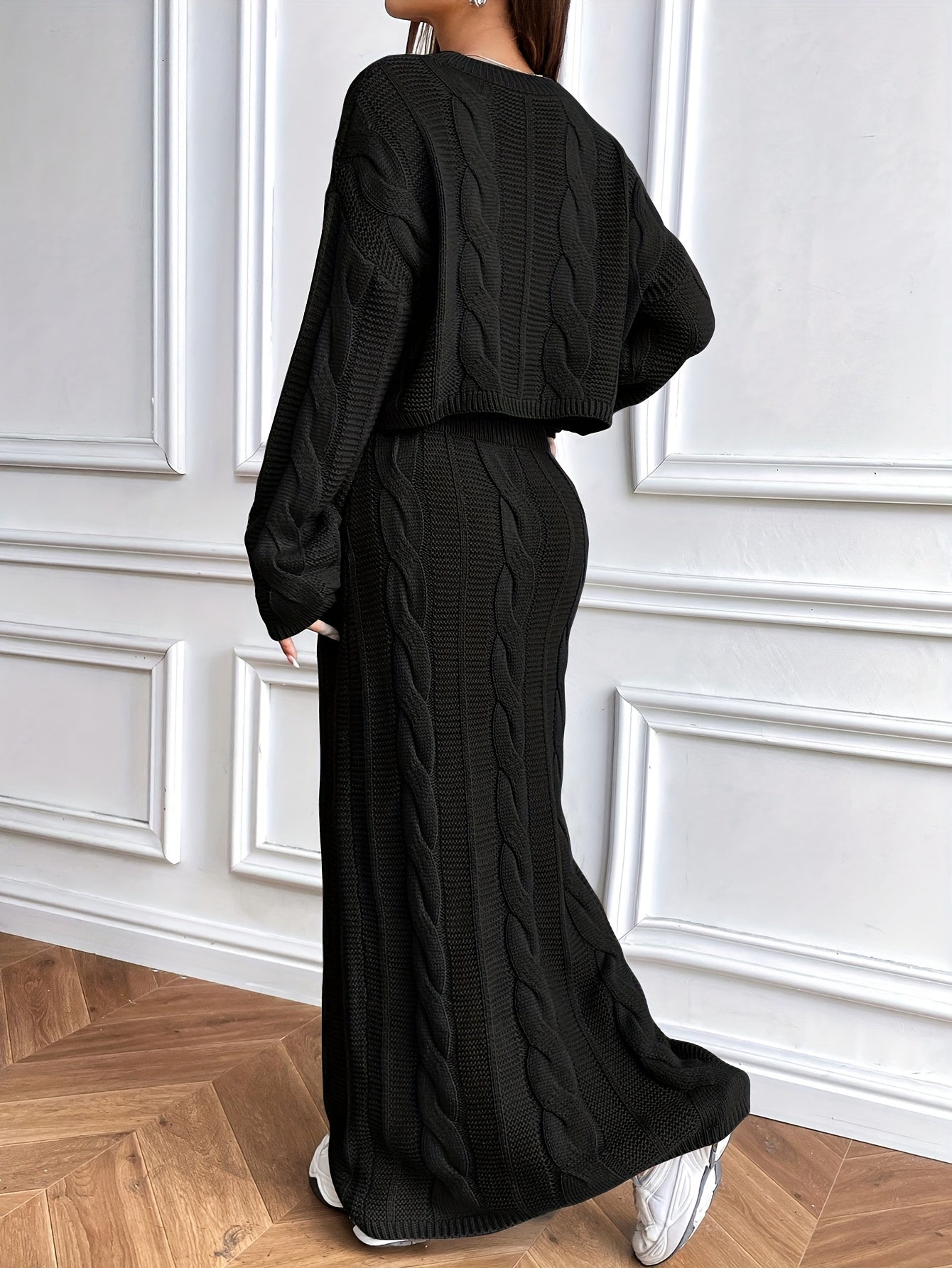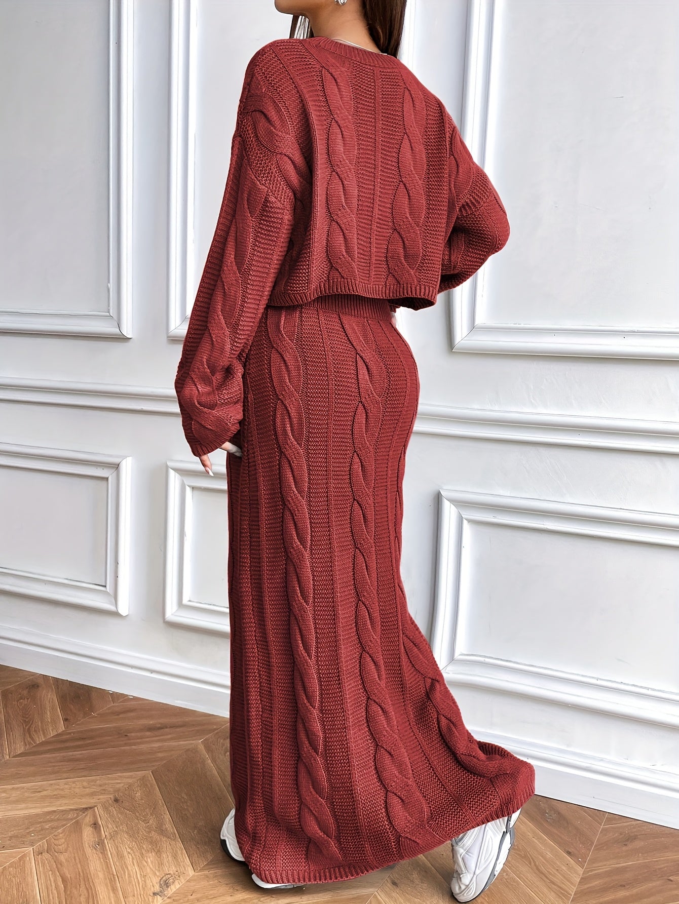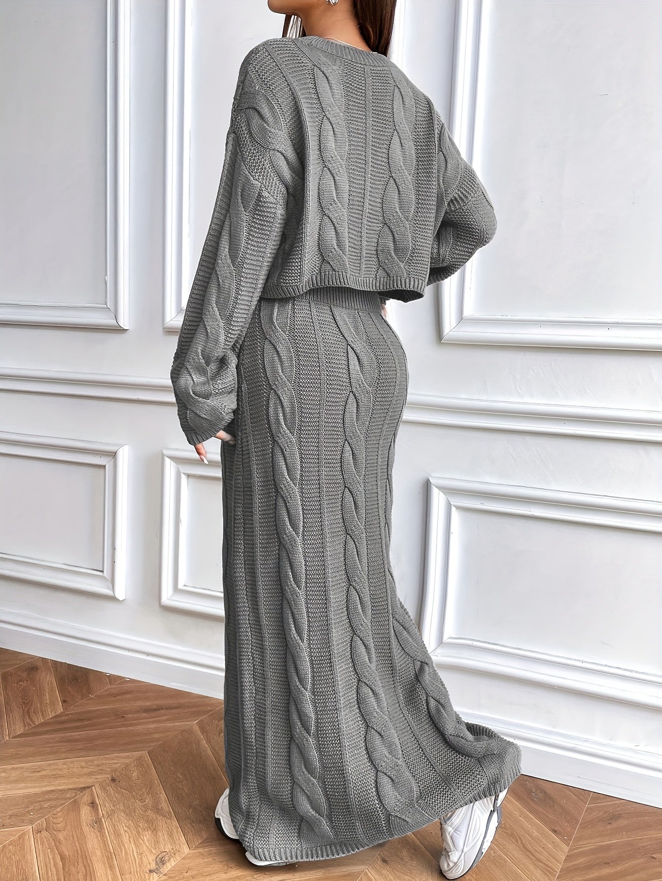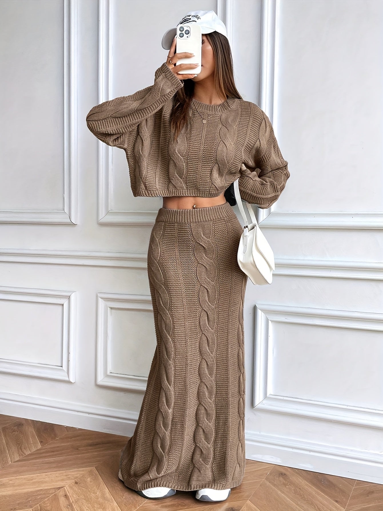 The Santa Monica Apparel™ | Grace Knit Set redefines everyday sophistication with a touch of timeless elegance. This two-piece ensemble features a relaxed long-sleeve crew neck top with a graceful drop-shoulder design, paired with a matching skirt that drapes effortlessly for a refined silhouette. Soft to the touch and luxuriously textured, it delivers both warmth and comfort—perfect for autumn and winter days when style and ease are equally important.