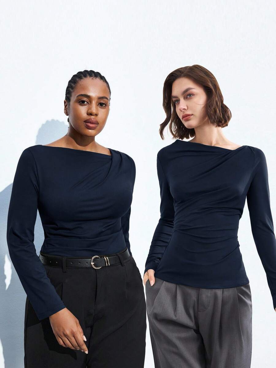 The Autumn Grace Top blends casual refinement with understated elegance. Featuring a soft boat neckline, draped ruching, and an asymmetrical silhouette, it offers a flattering fit ideal for daily wear or seasonal gatherings.