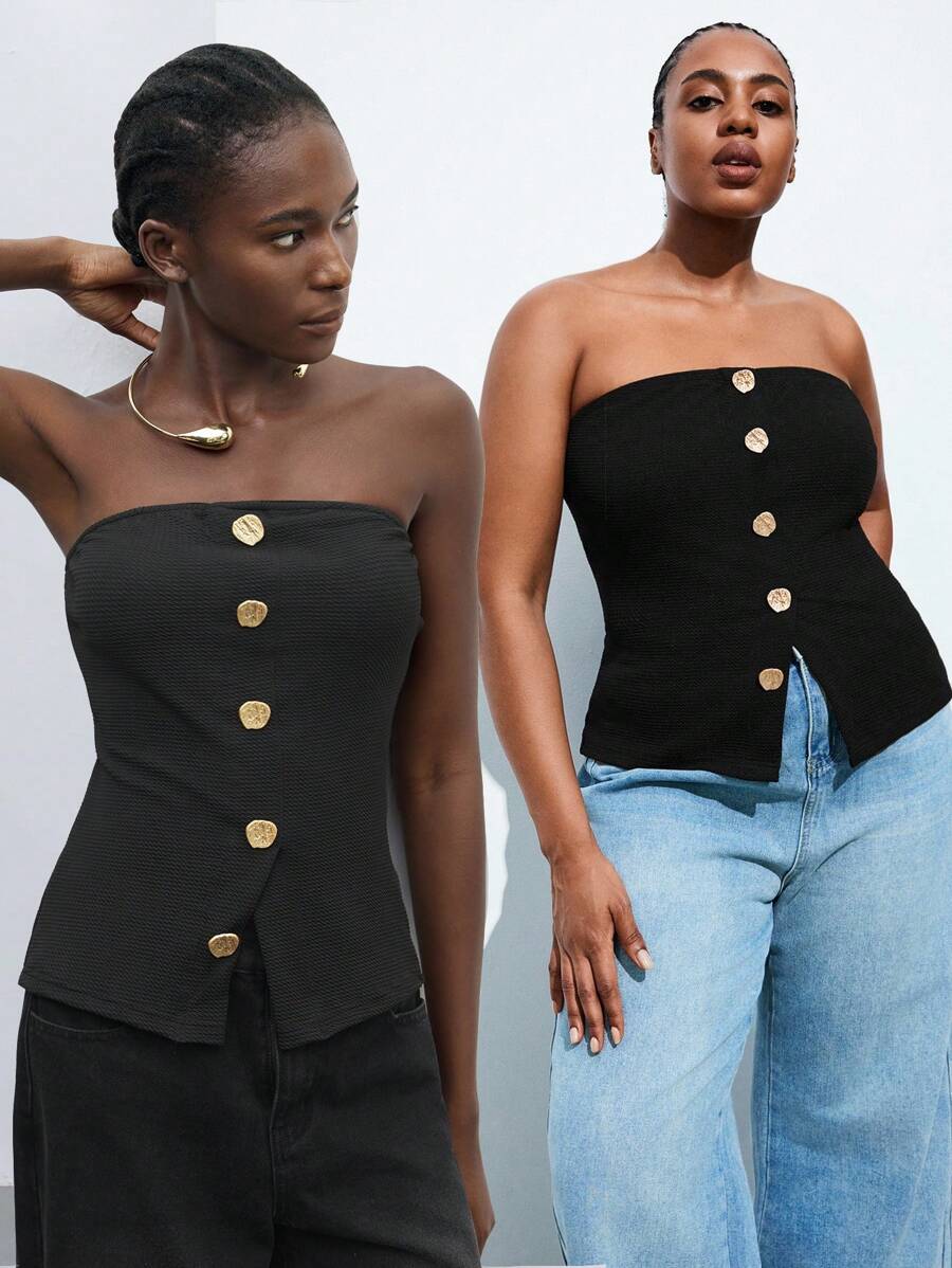 The Crimson Muse Strapless Top embodies bold femininity with its colorblock pattern and asymmetrical button-front design. Perfect for evenings out, festive gatherings, or chic daytime looks, it delivers a confident, sculpted silhouette that radiates modern allure.