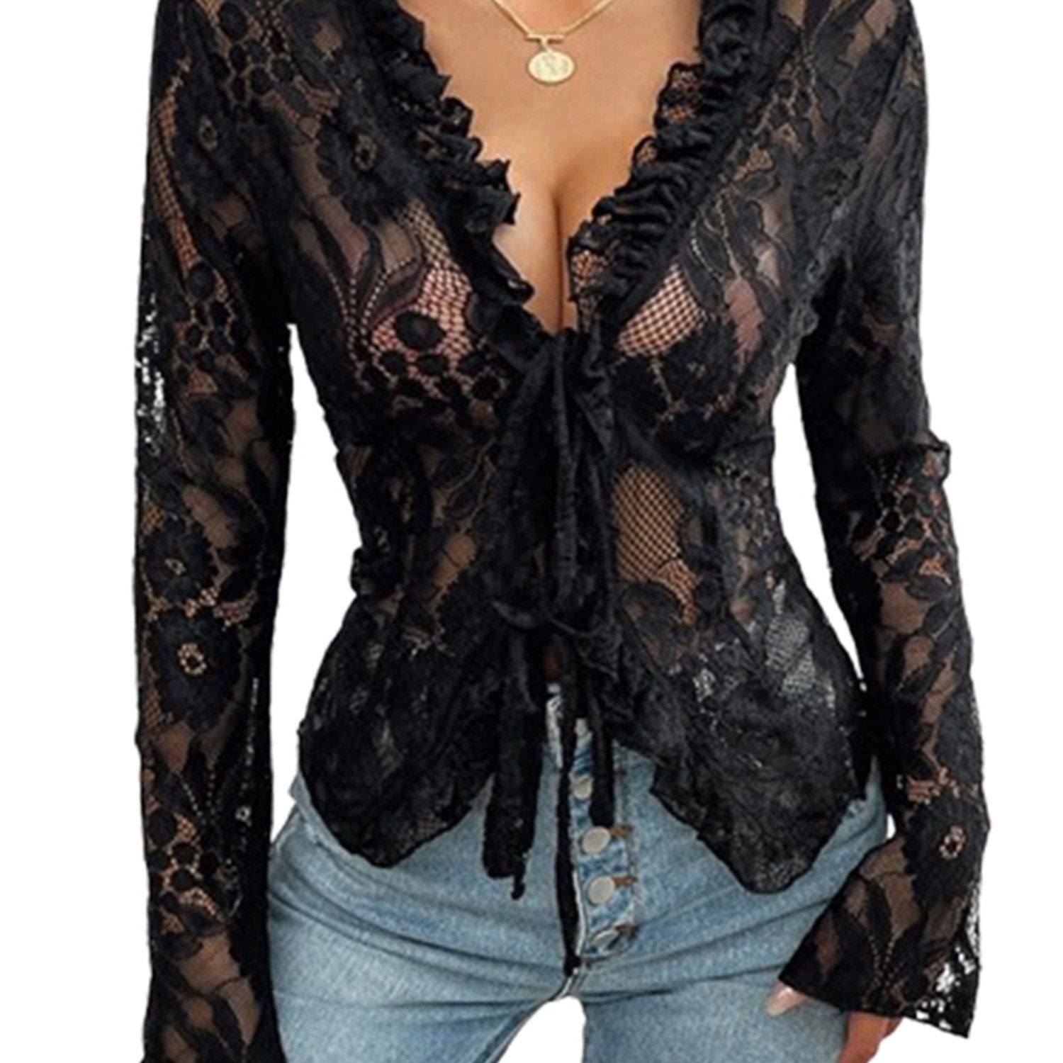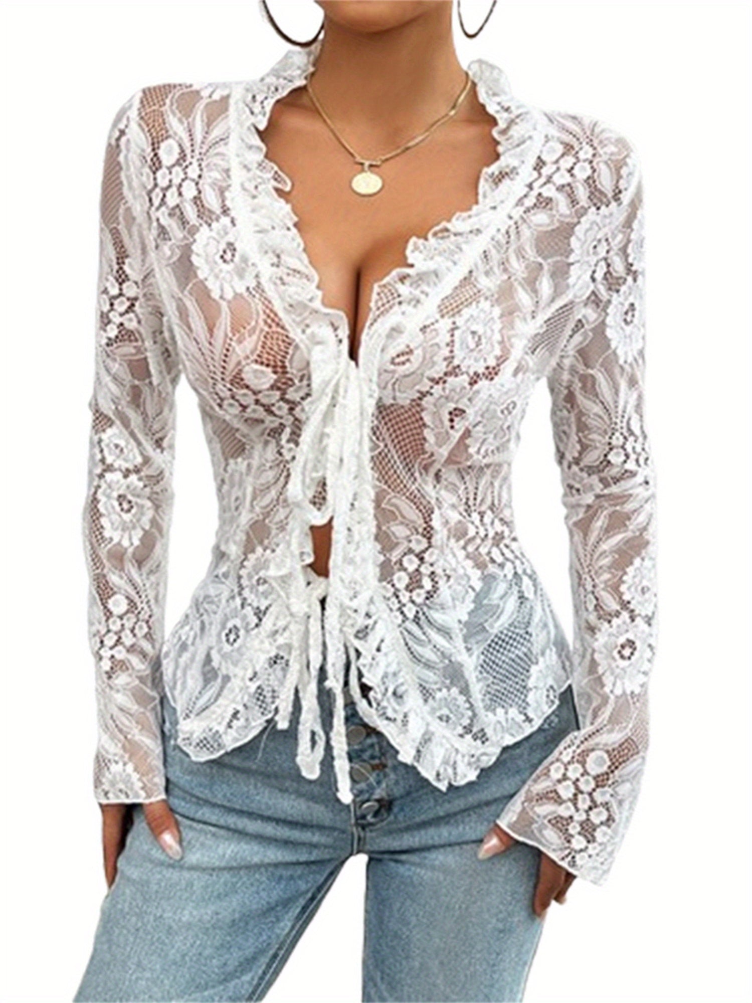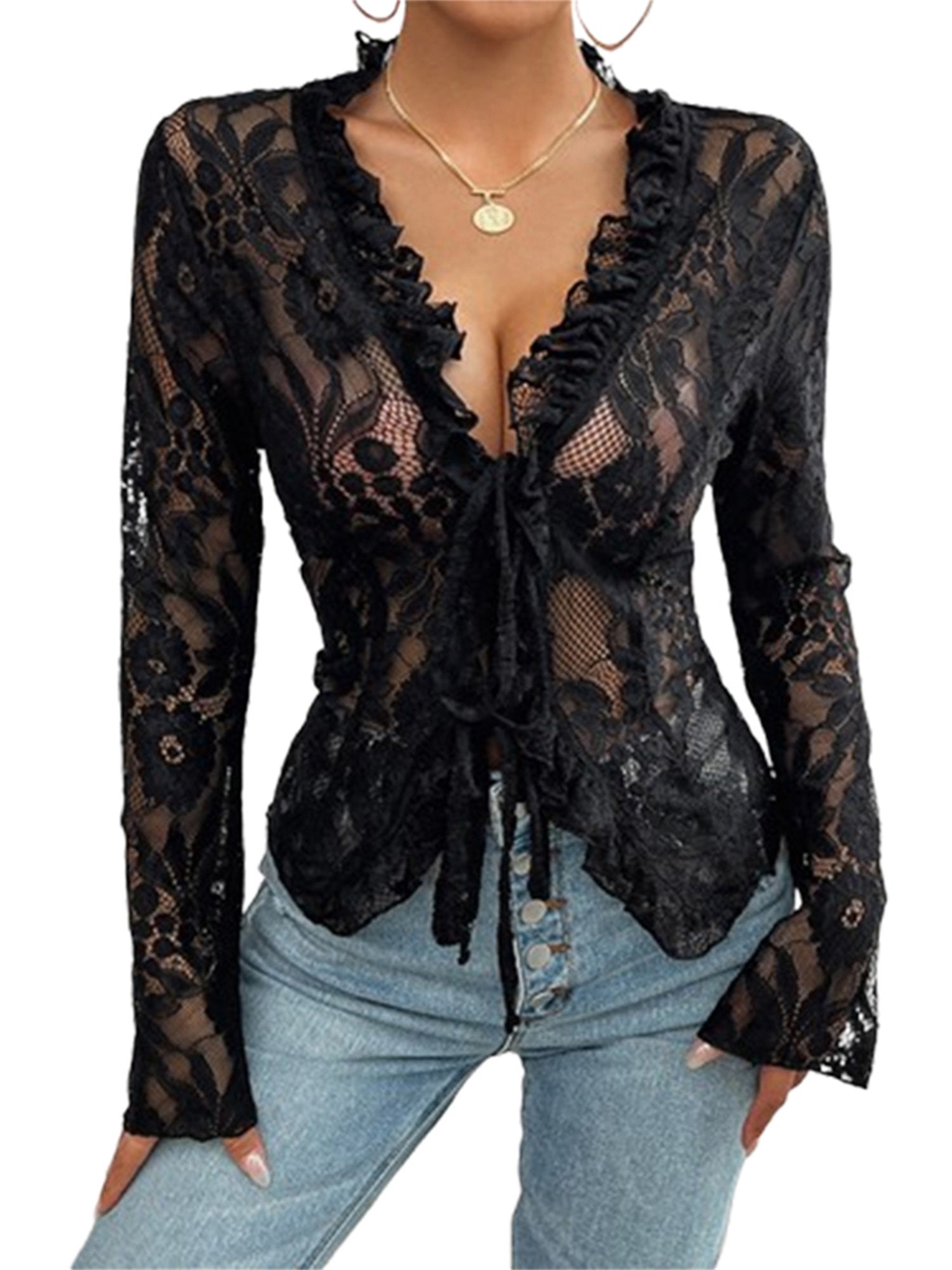 Delicate, feminine, and irresistibly chic — this semi-sheer solid-color top combines softness with subtle allure. Crafted from lightweight polyester blended with a touch of elastane, it offers a comfortable, breathable fit that drapes beautifully. The refined V-neckline framed by contrast lace adds a sexy yet elegant edge, making it the perfect piece for elevated spring and summer styling.